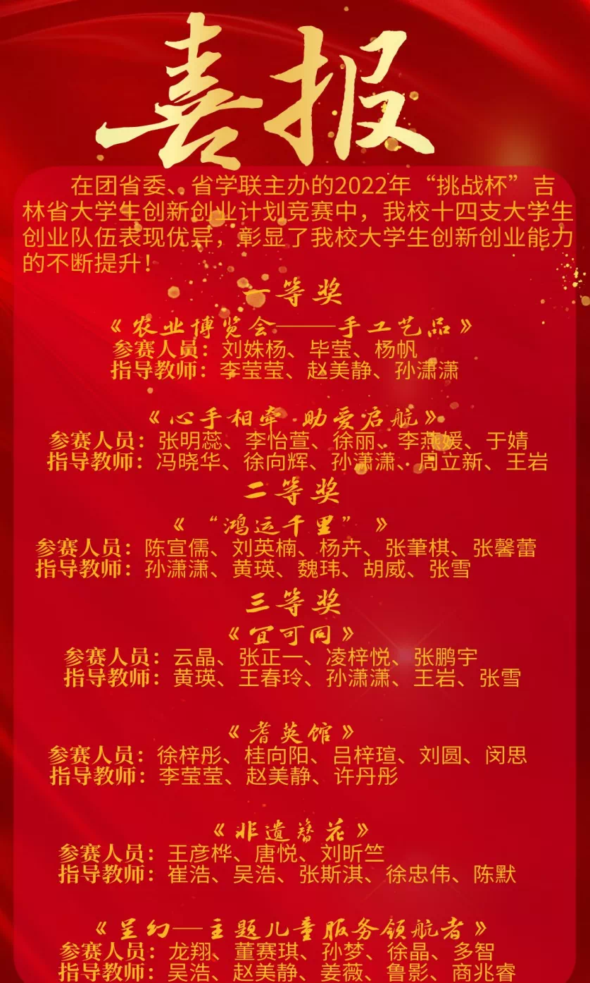 我校高度重视2022“挑战杯”吉林省大学生创业计划竞赛,积极发动学生广泛参与。在校党委的领导下,指导教师、各项目负责人及团队成员多方协作,认真备赛、精心打磨项目申报材料,为各参赛队伍取得优异成绩打下坚实基础。