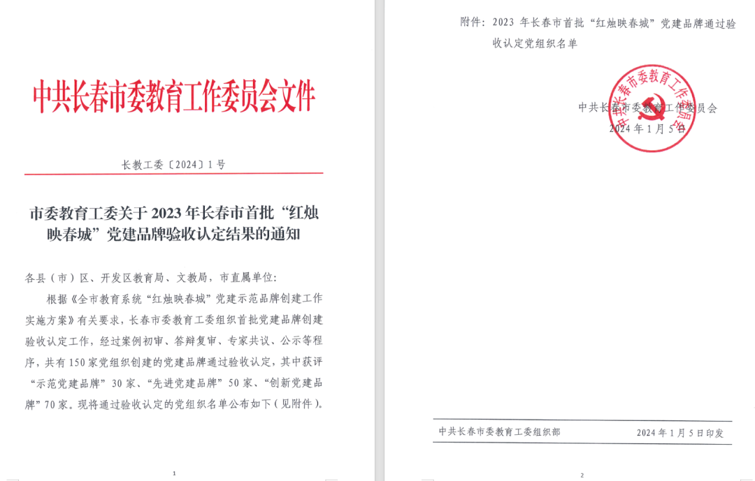 为全面强化首批“红烛映春城”党建示范品牌创建试点单位工作成效,进一步发挥党建引领作用,助力长春教育高质量发展,根据《全市教育系统“红烛映春城”党建示范品牌创建工作实施方案》要求,长春市委教育工作委员会组织首批党建品牌创建验收认定工作——“2023年度党建品牌申报单位答辩会”,全市共187家创建单位参与评审,经过案例初审、答辩复审、专家共议等程序,我校被认定为“示范党建品牌”党组织。