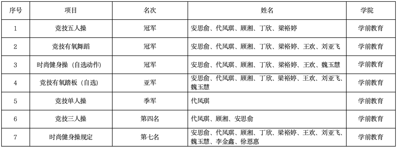 我校健美操队在领队姚晓东老师和教练刘畅老师的带领与指导下,派出十名运动员参加七个不同项目的比赛。经过激烈的角逐,最终我校学子取得了三项冠军、一项亚军、一项季军、一项第四名以及一项第七名的优异成绩!运动健儿们在赛场上旋转跳跃、托举抛接,充分展现了健美操的魅力,跳出属于他们的青春飞扬。他们从演出音乐到服装造型,从舞蹈动作到面部表情,队员们久久为功,精益求精,以精湛的技艺、默契的配合和活力四射的操化动作,展现了师专学子积极向上、昂扬奋进的精神风貌,为学校赢得了荣誉!