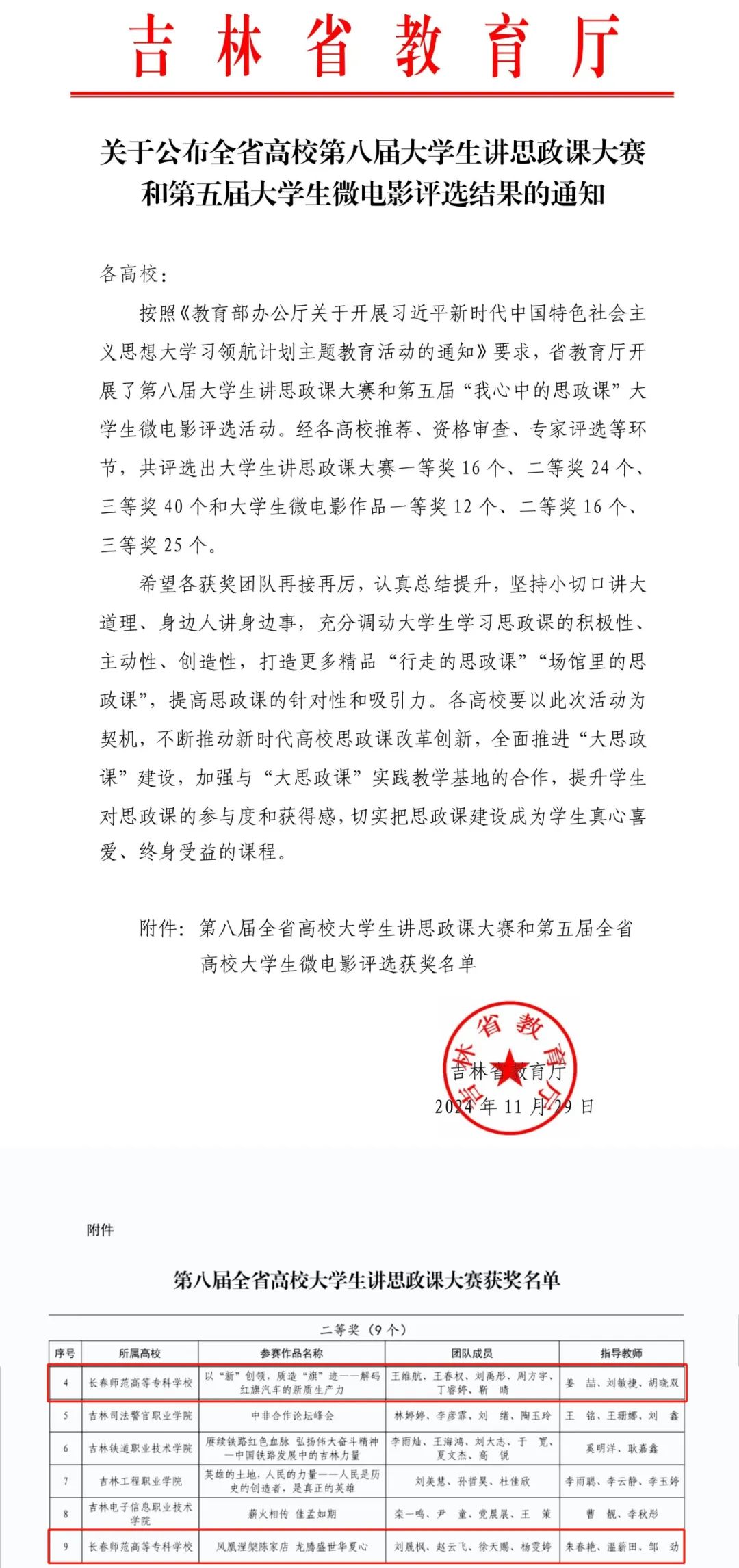 11月29日,吉林省教育厅公布了《第八届全省高校大学生讲思政课大赛获奖名单》,我校推荐参赛的《以“新”创领,质造“旗”迹——解码红旗汽车的新质生产力》《凤凰涅槃陈家店 龙腾盛世华夏心》2个作品,荣获高职组二等奖。