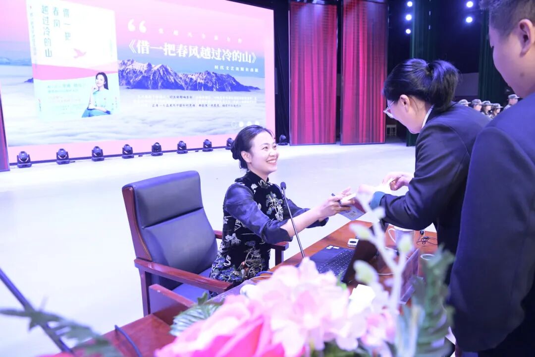 在随后的签名环节,师生代表上台接受张超凡老师亲笔签名的个人著作《借一把春风越过冷的山》,并与她合影留念。签名环节温馨有序,现场气氛热烈。